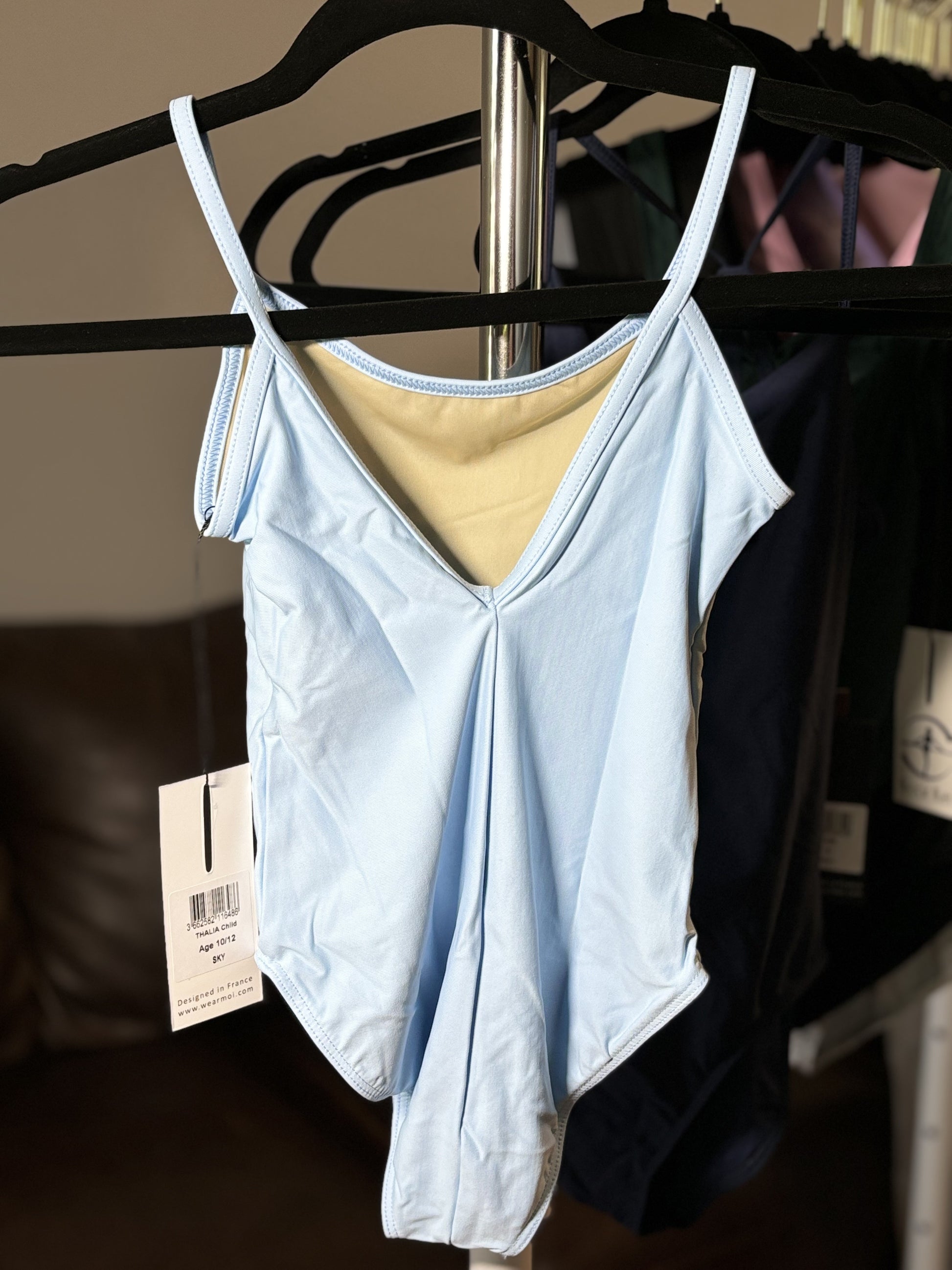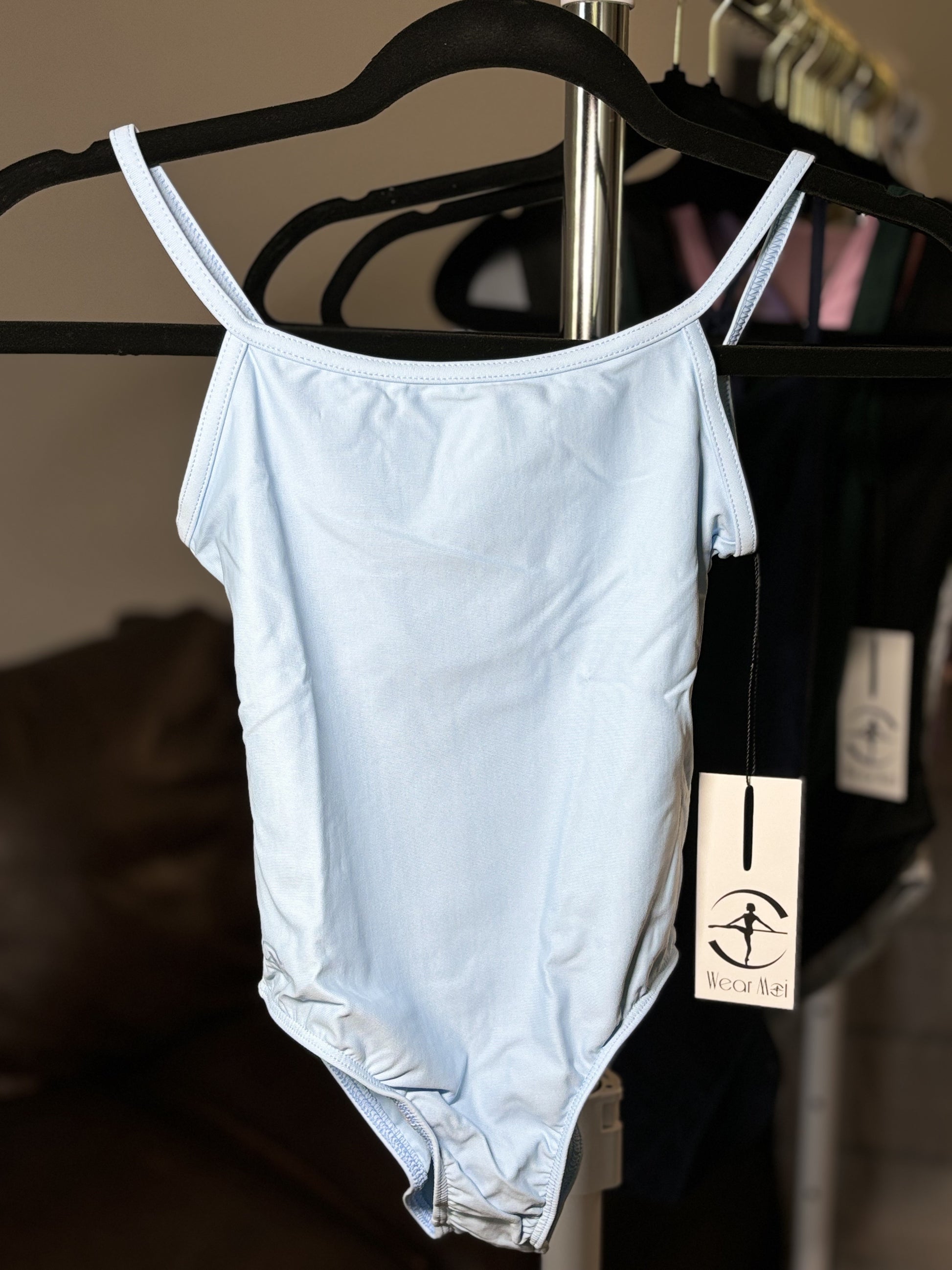 Basic camisole leotard with a V-back and back seam.
